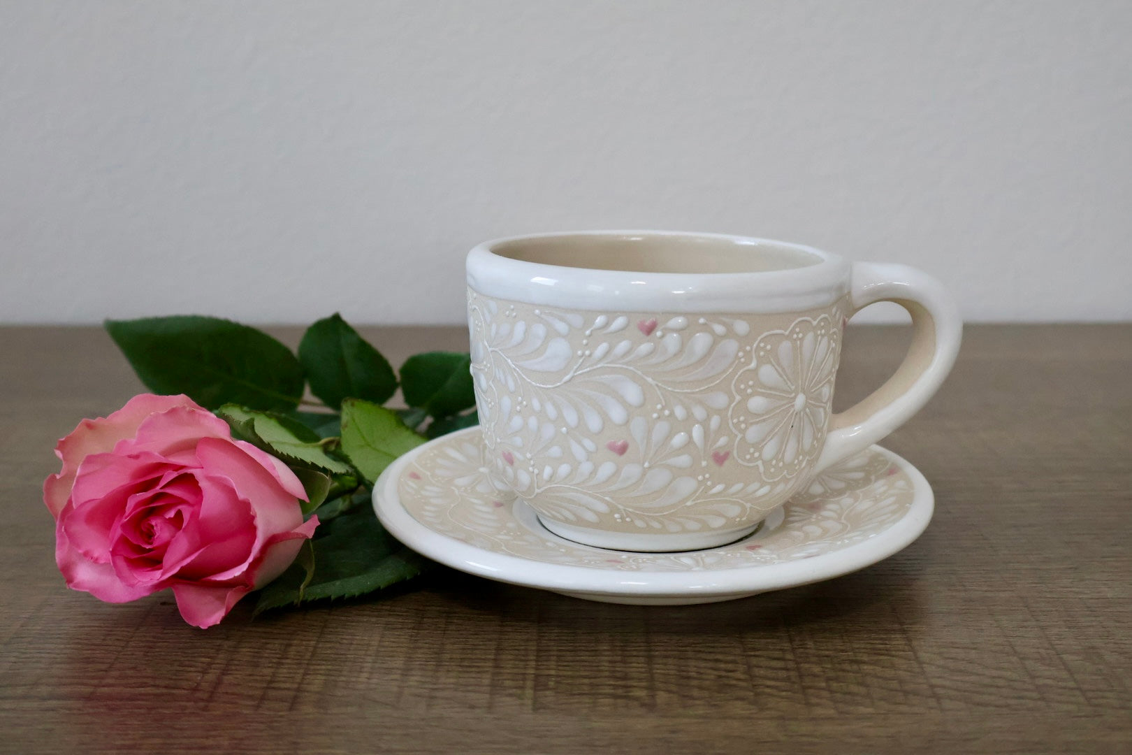 This lovingly handcrafted mug and matching plate feature delicate white plumado strokes and soft pink hearts 💕 — a gentle reminder of love, warmth, and cozy mornings.